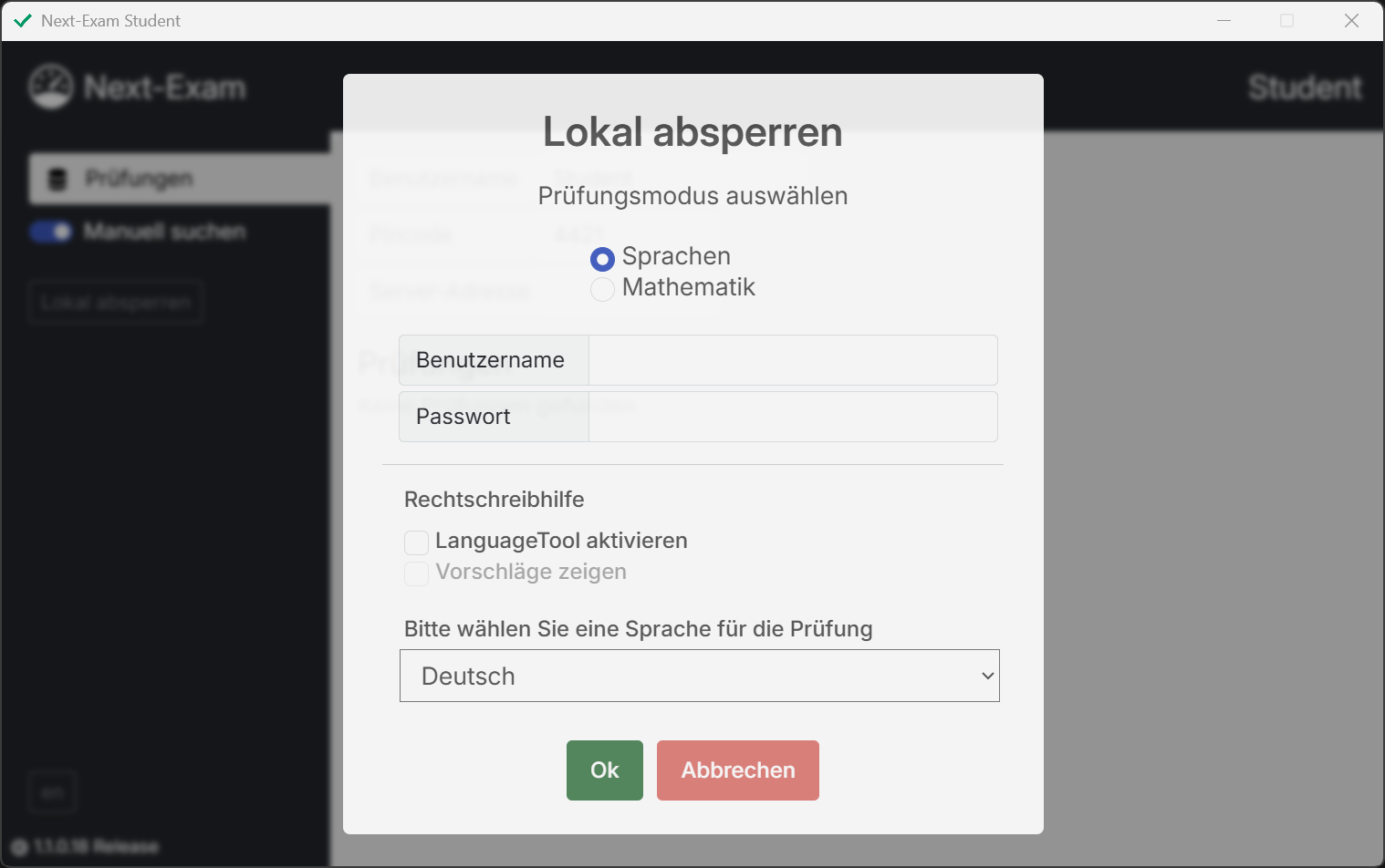 Wenn einzelne Computer abgesperrt werden sollen und eine Steuerung über eine Teacher-Instanz nicht notwendig ist, kann die Funktion "Lokal absperren" verwendet werden. Am Dashboard befindet sich dafür ein Button "Lokal absperren". Die Modi Mathematik und Sprachen mit grundlegenden Einstellungsmöglichkeiten sind vorhanden.